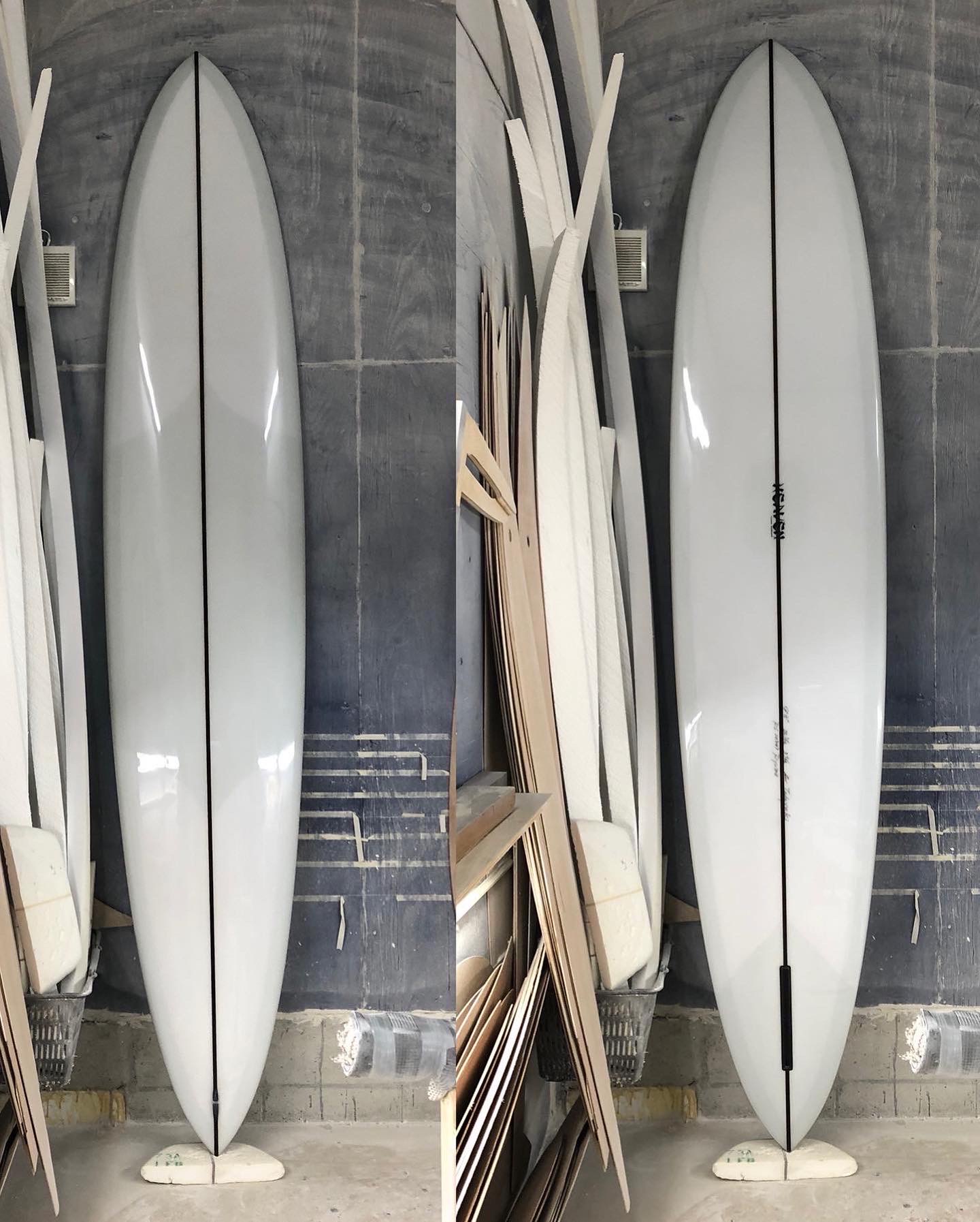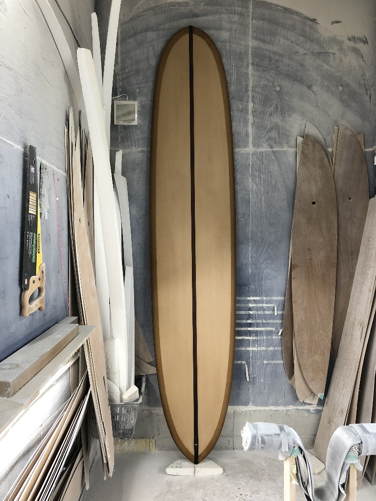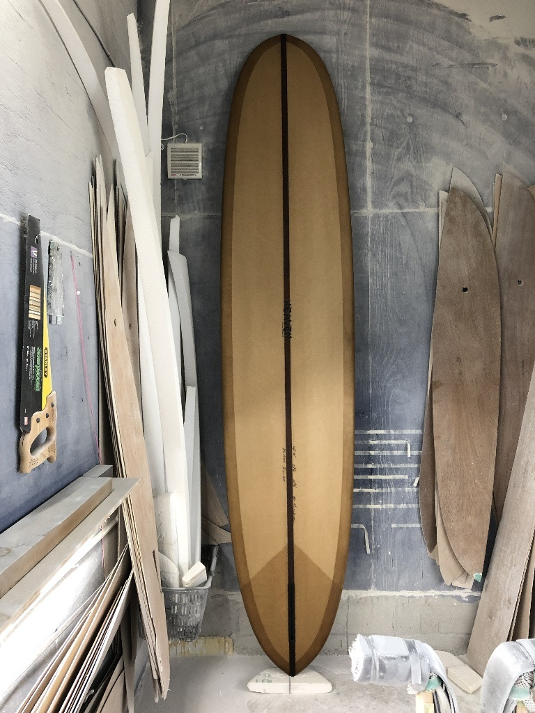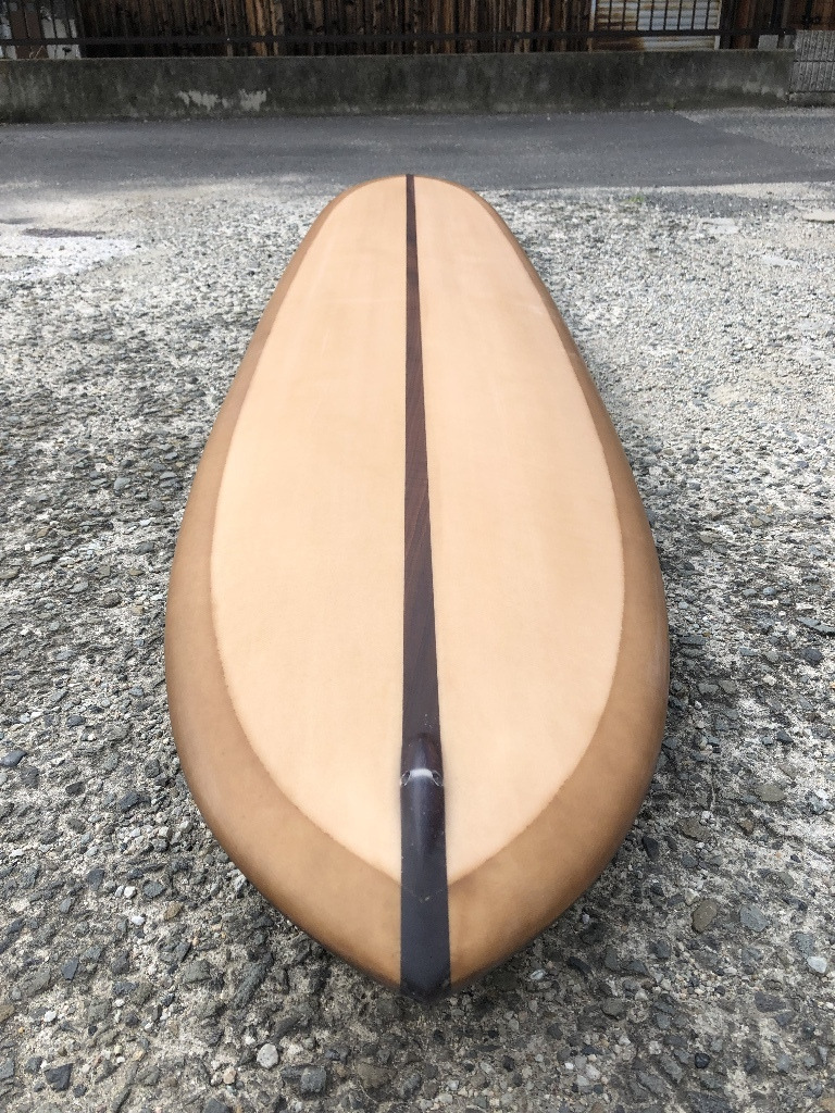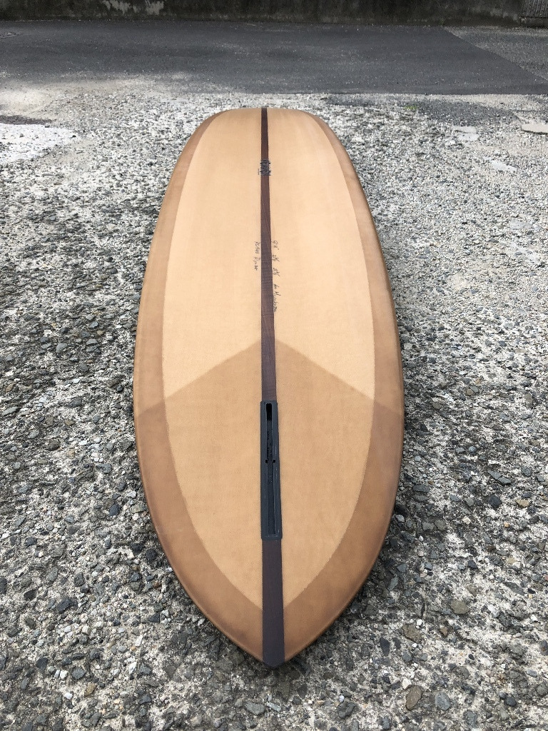 イーグルノーズ、テールはGUN、ロッカーはロングボード テールの薄さ、エッジ、ダウンレールのボリューム 8オンスボランで巻いた腕に感じる重み 調子はすこぶる良いそうだ スルスルと滑りだし、一番アウトのセットのいいやつをつかむことができるそうだ ガンのノーズロッカーではなく、ロングのノーズロッカーだからアベレージサイズの波では、こちらのロッカーの方が滑り出しは早いのだろう 乗れば、波に合わせているだけでどんどん走っていくのでコントロール性も高いとのこと